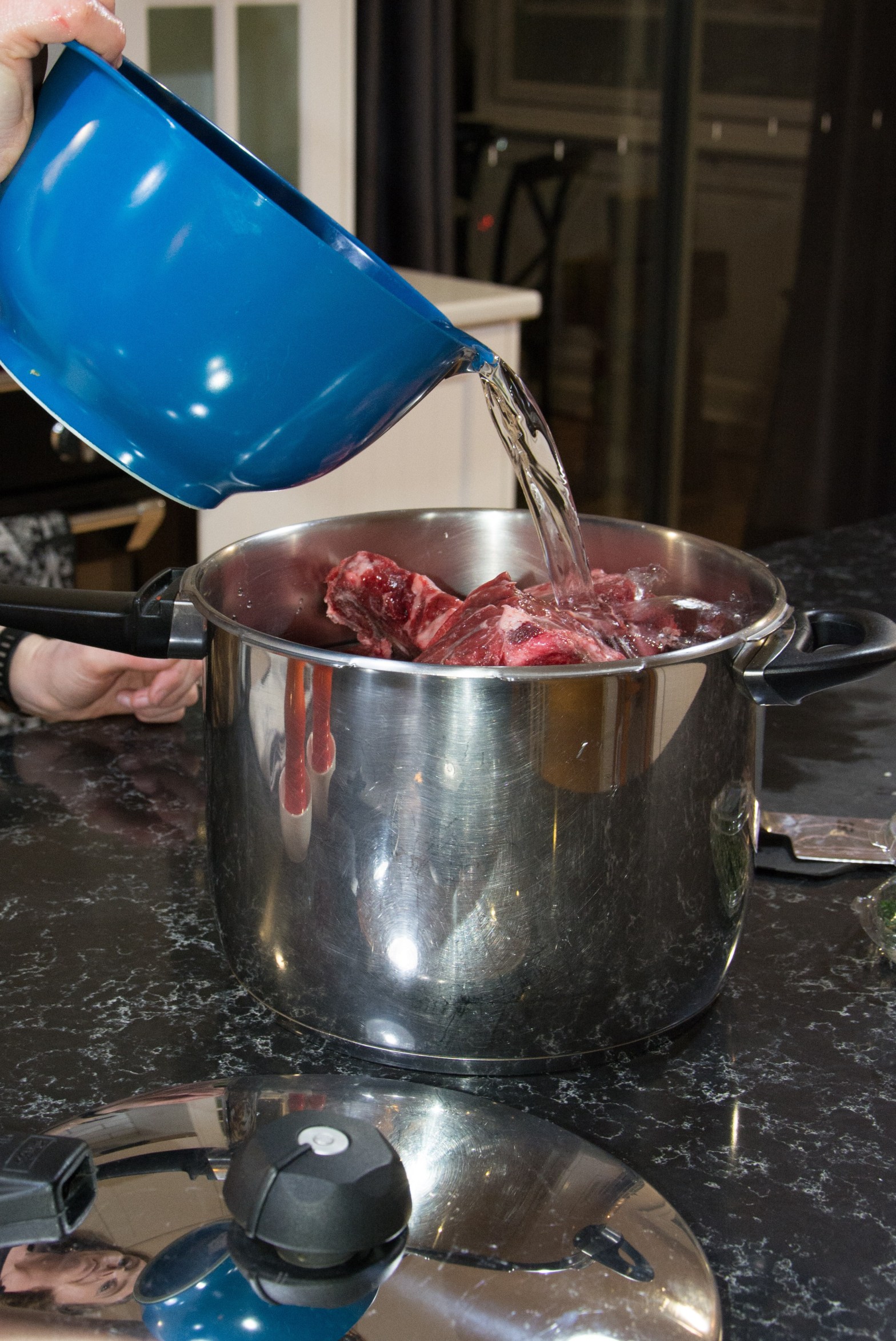 In an 8 litre pressure cooker, heat the oil over a medium-high heat. In batches, add bones and shanks and cook, turning occasionally, until lightly browned, about 6 minutes. Transfer to a plate and set aside.